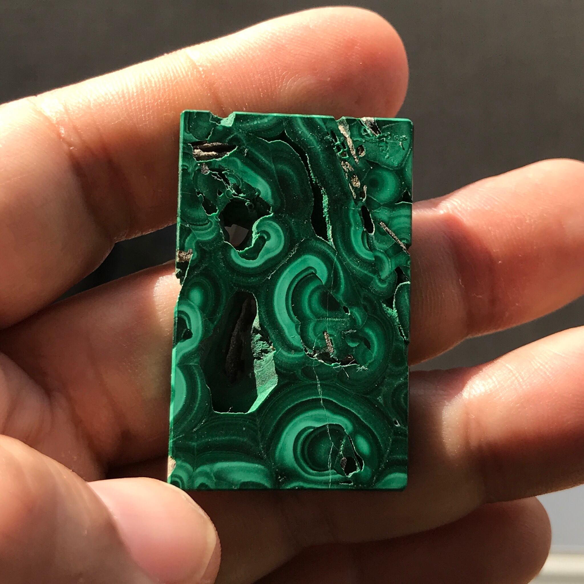 こちらは珍しいプレートタイプのマラカイト。原石から切り出して研磨した成り立ちがよくわかる秀品です。天眼模様だけでなくところどころにある空洞が個体によってはドゥルージー状になっていて、キラキラしている子もあります。