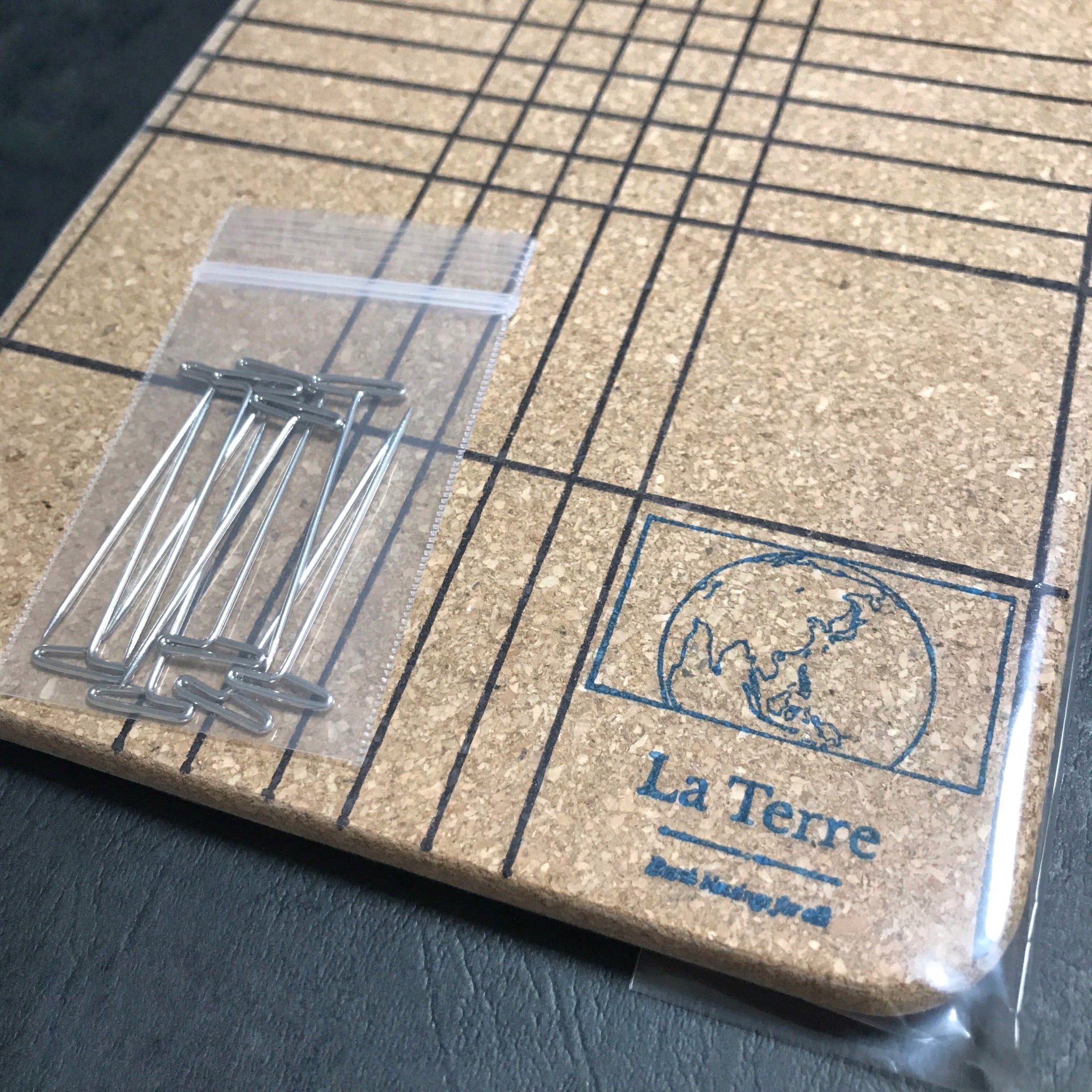 コルクのしっかりした硬さと厚みで編み作業を支えます。